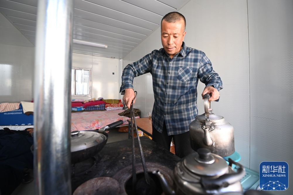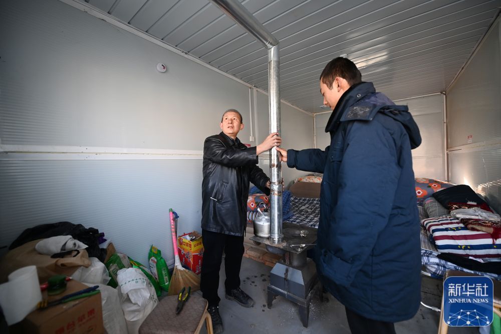 12月29日,在积石山县刘集乡高李村板房安置点,村民往火炉中加煤块。