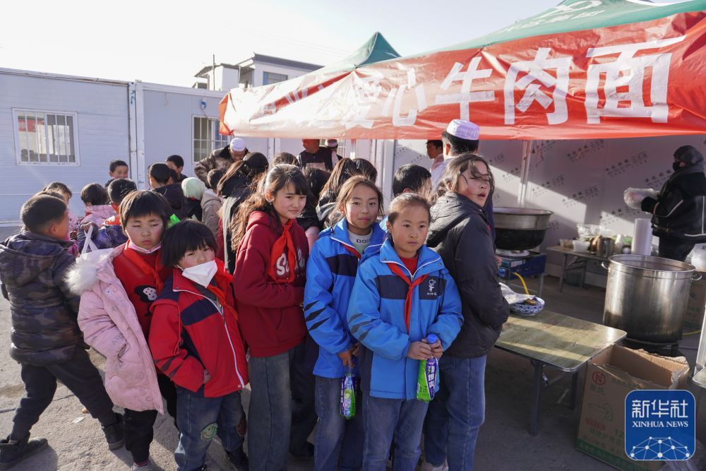 12月29日,在积石山县柳沟乡尕集村板房安置点,学生们下学后恭候吃饭。