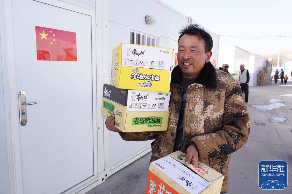 12月29日,在积石山县刘集乡高李村板房安置点,受灾众人领取物质。