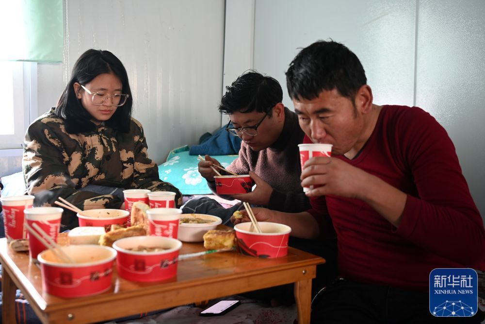 12月29日,在积石山县大河家镇大河村板房安置点,受灾众人在板房内吃饭。
