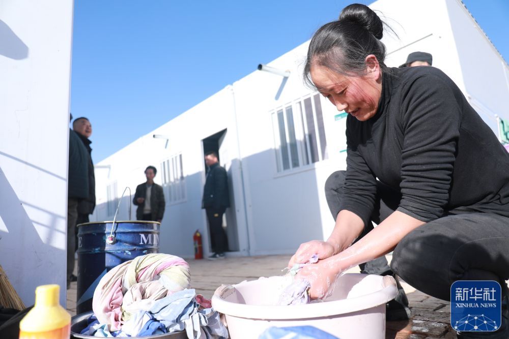 12月29日,在积石山县石塬镇沈家坪村板房安置点,村民在板房外洗穿戴。 |